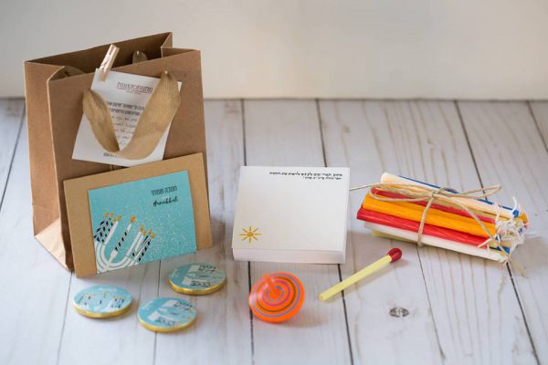 מארז הפתעה לחנוכה הכולל סט נרות מלא, 5 שוקולדים מטבעות, סביבון, 100 דפי ממו ממותגים ועט בצורת גפרור.