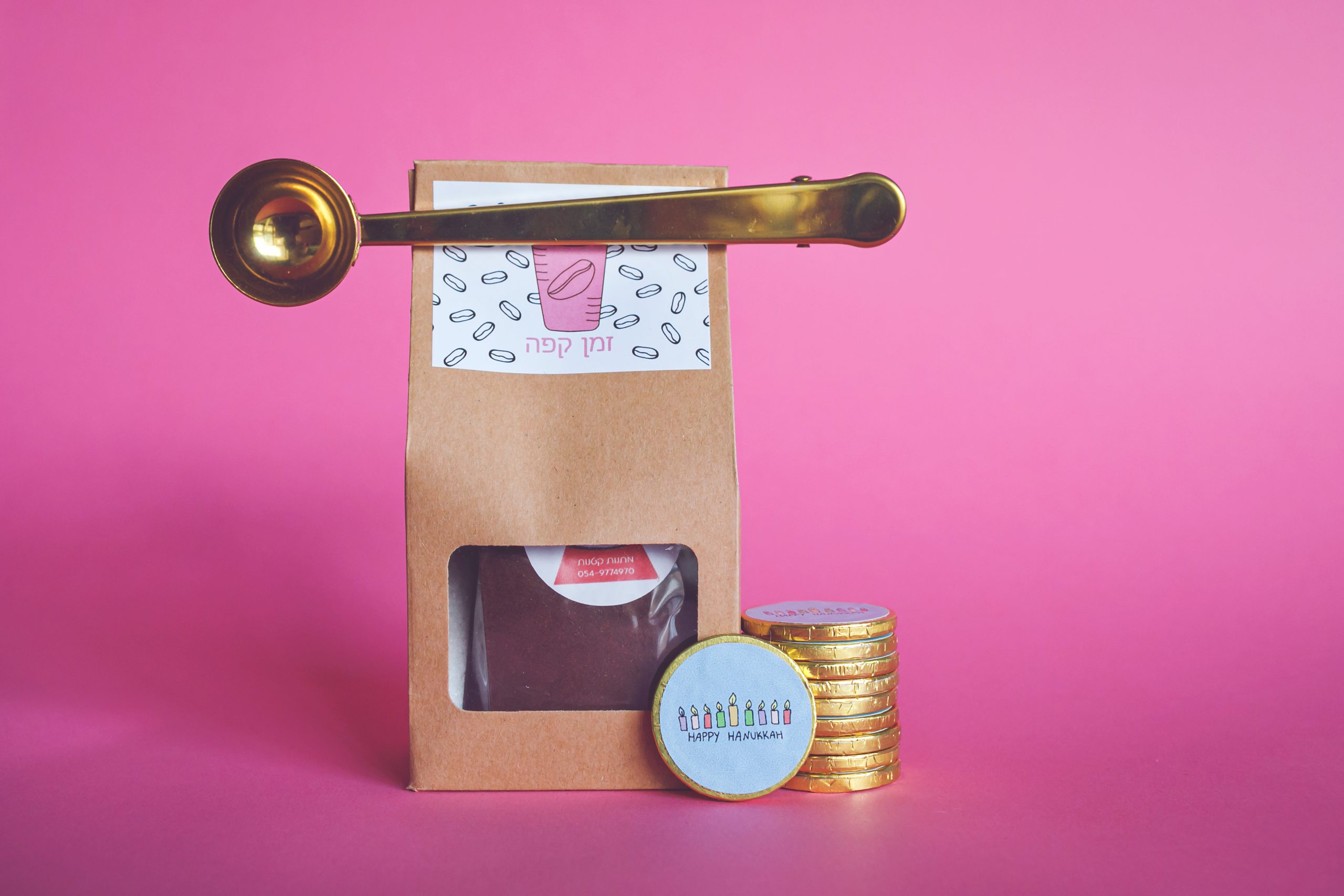 ערכת חנוכה הכוללת קפה שחור טחון, מטבעות שוקולד וכף לקפה.