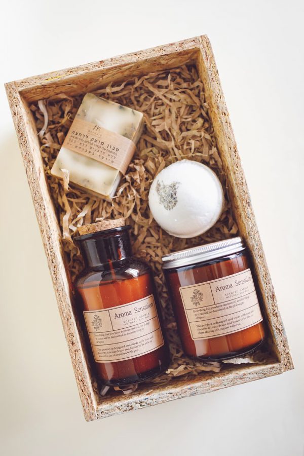 מארז ריחני מושלם שכולל שני נרות אולד פאשן, סבון מוצק בעבודת ופצצת אמבטיה