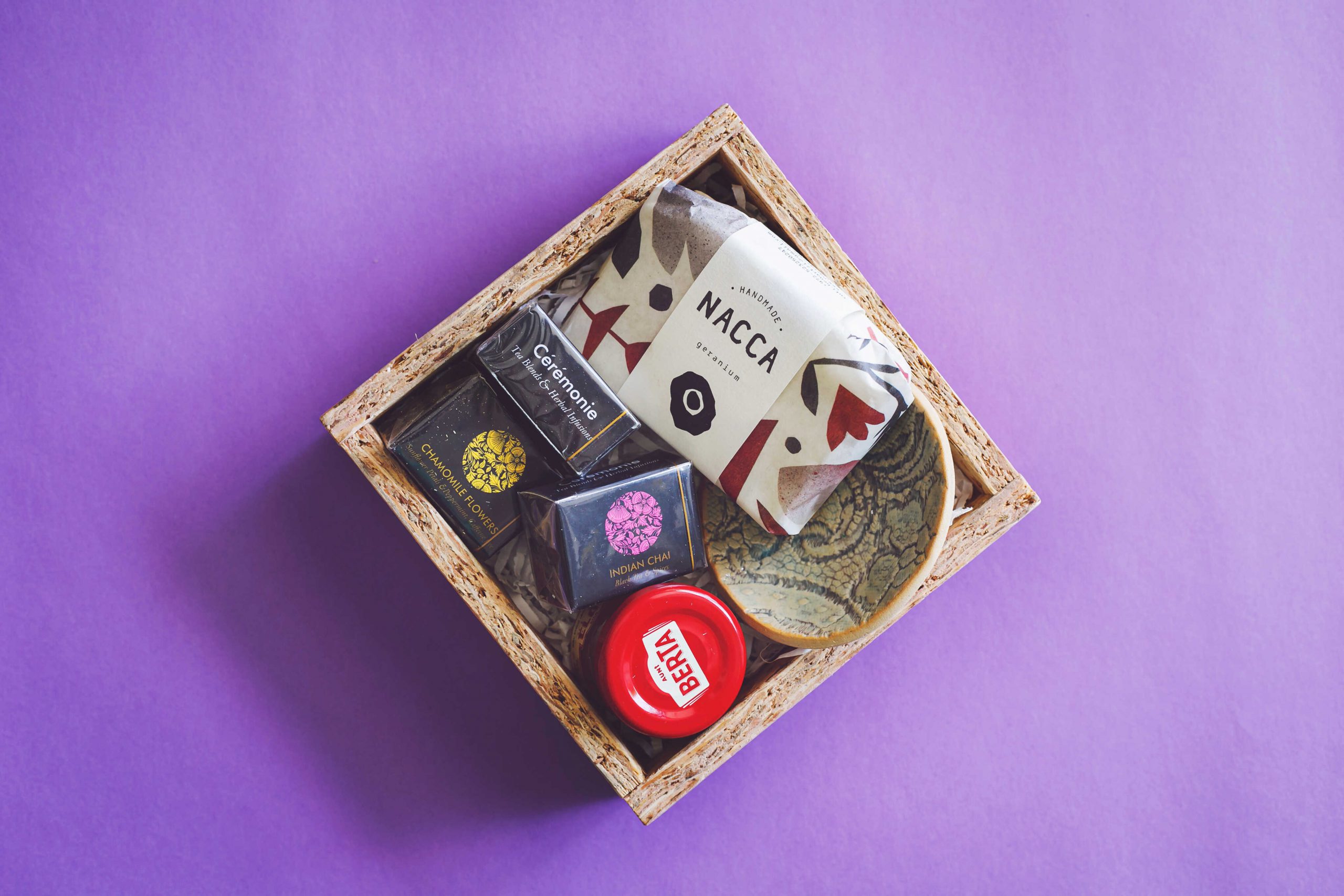 ערכה טבעית הכוללת קוביות תה, ריבה מתוקה, קערית קרמיקה, וסבון גליצירין בעבודת יד.