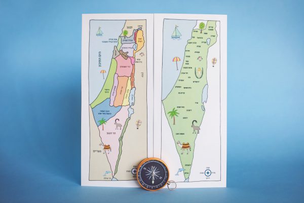 מפת ארץ ישראל מחולקת לפי אזורים גיאוגרפיים או ערים בשילוב מצפן קטן.