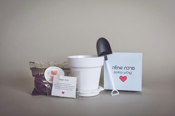 ערכת שתילה חברתית בכד קטן מעוצב בחבק ממותג הכוללת כד, אדמה, זרעים וכף קטנה.