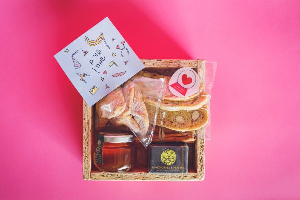 משלוח מנות הכולל דבש 60 גרם, 2 קובית תה, מקלות קינמון, 2 אוזני הזמן ועוגיות ביסקוטי.